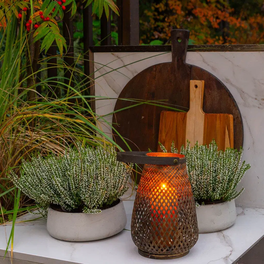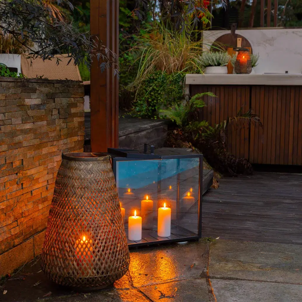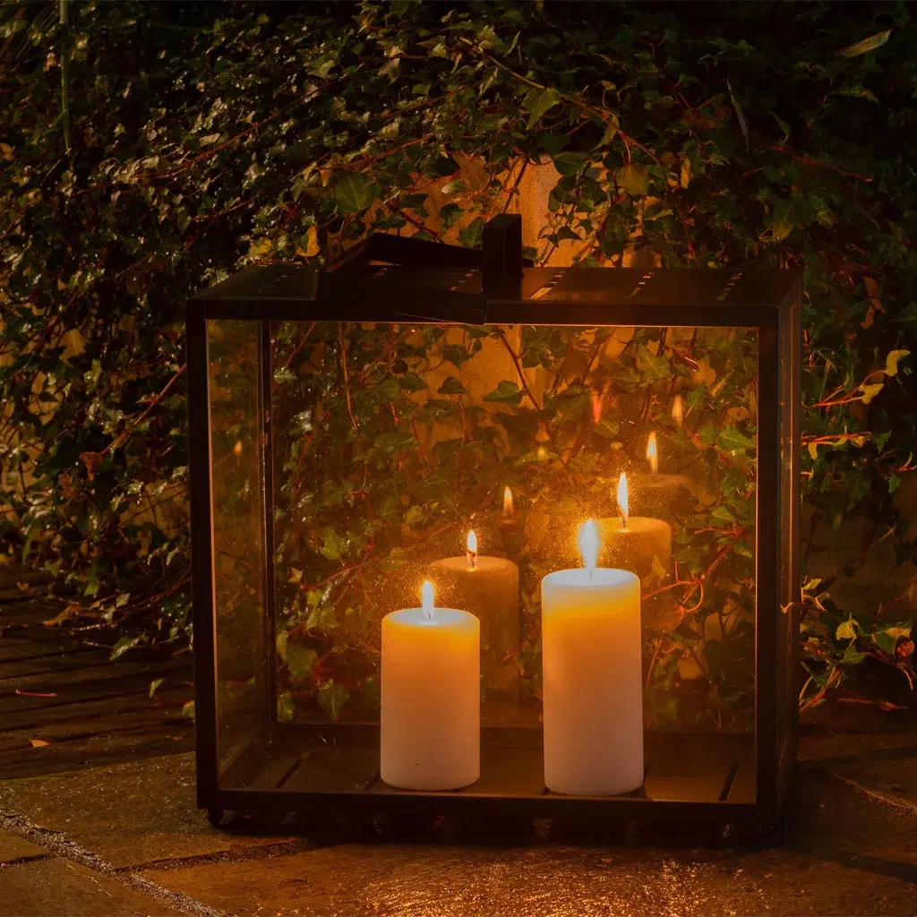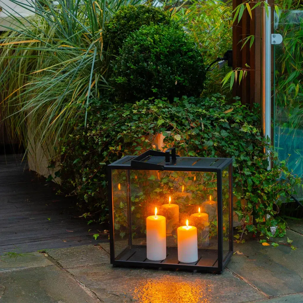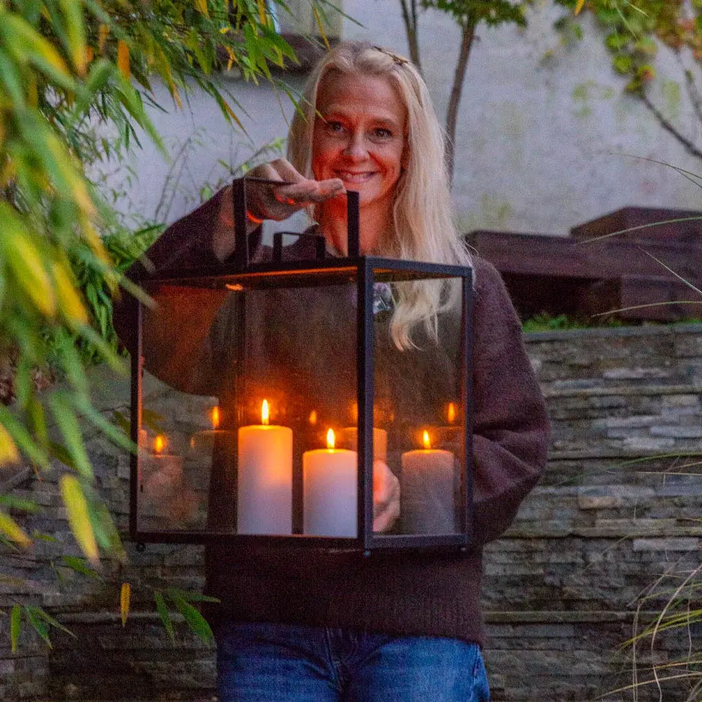 Hanne often uses LED pillar candles in her outdoor lanterns. They turn on and off by themselves, so she doesn’t have to keep an eye on them.