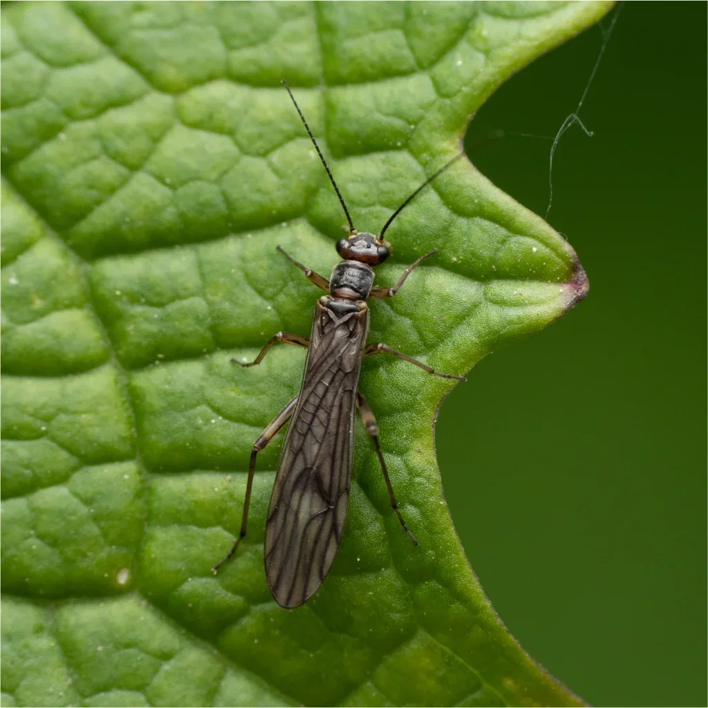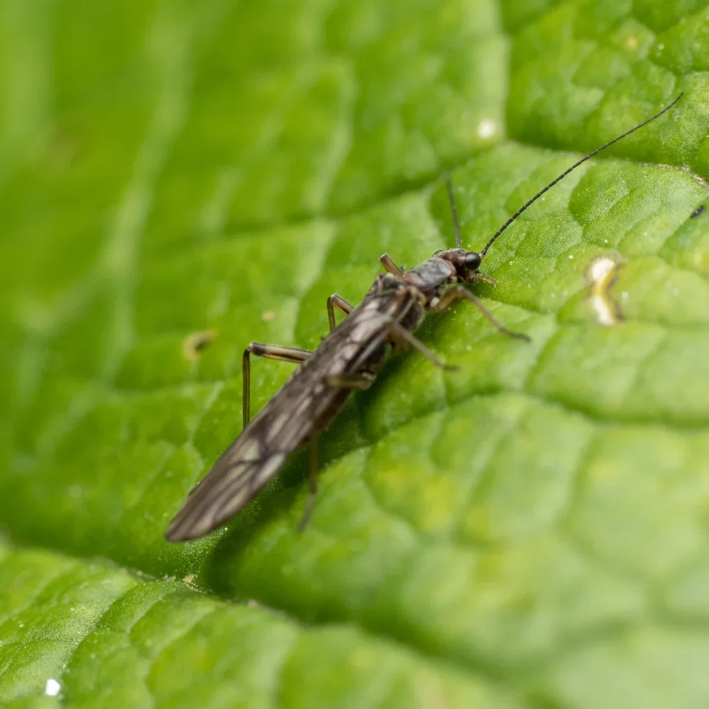 An adult thrips, ready to lay eggs. Adult individuals are often darker and fly when disturbed, which contributes to rapid spread between the plants.
