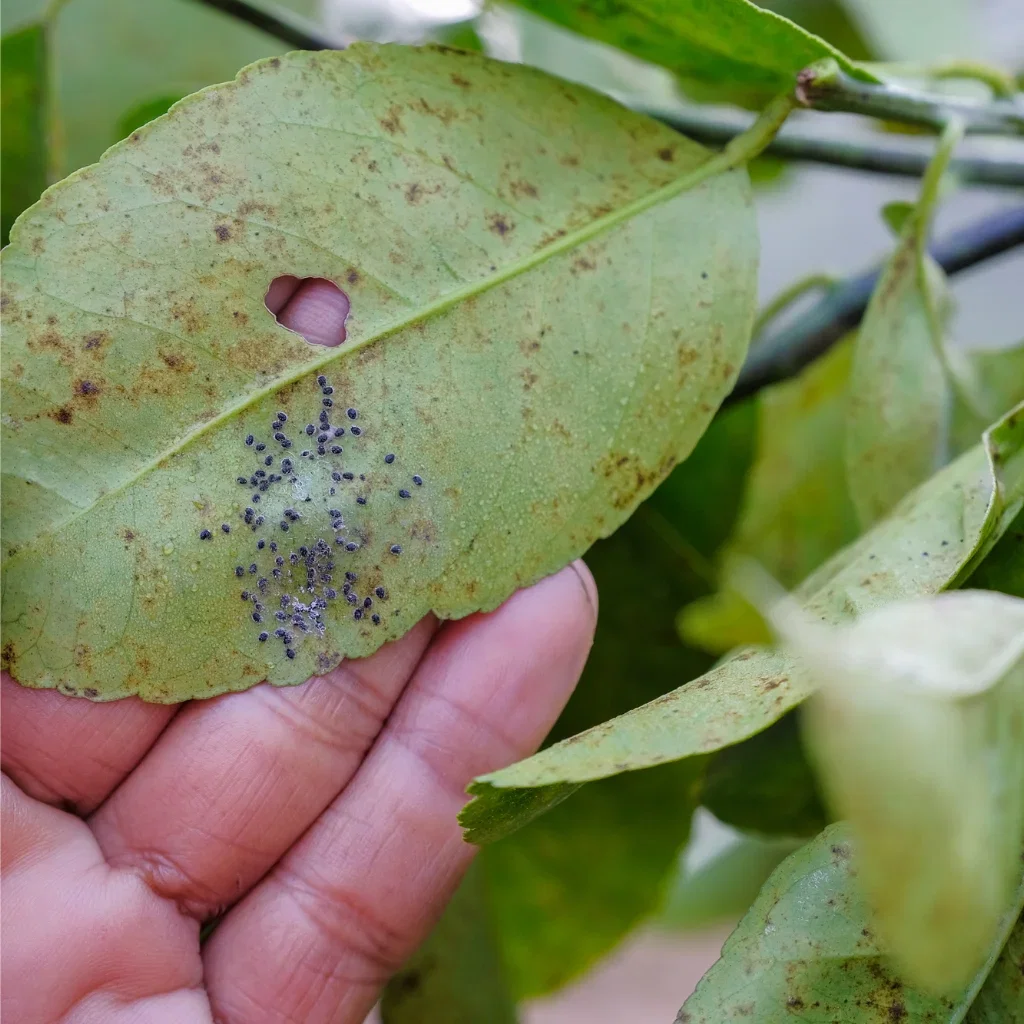 The thrips' excrement on the underside of a leaf is a clear sign that the plant has been attacked by the troublesome guest.