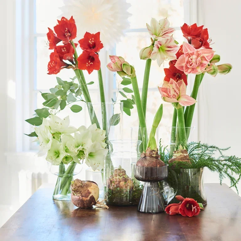 - Utvalget av farger er stort og man kan velge mellom hvit amaryllis, røde amaryllis, og rosa, oransje og røde nyanser.