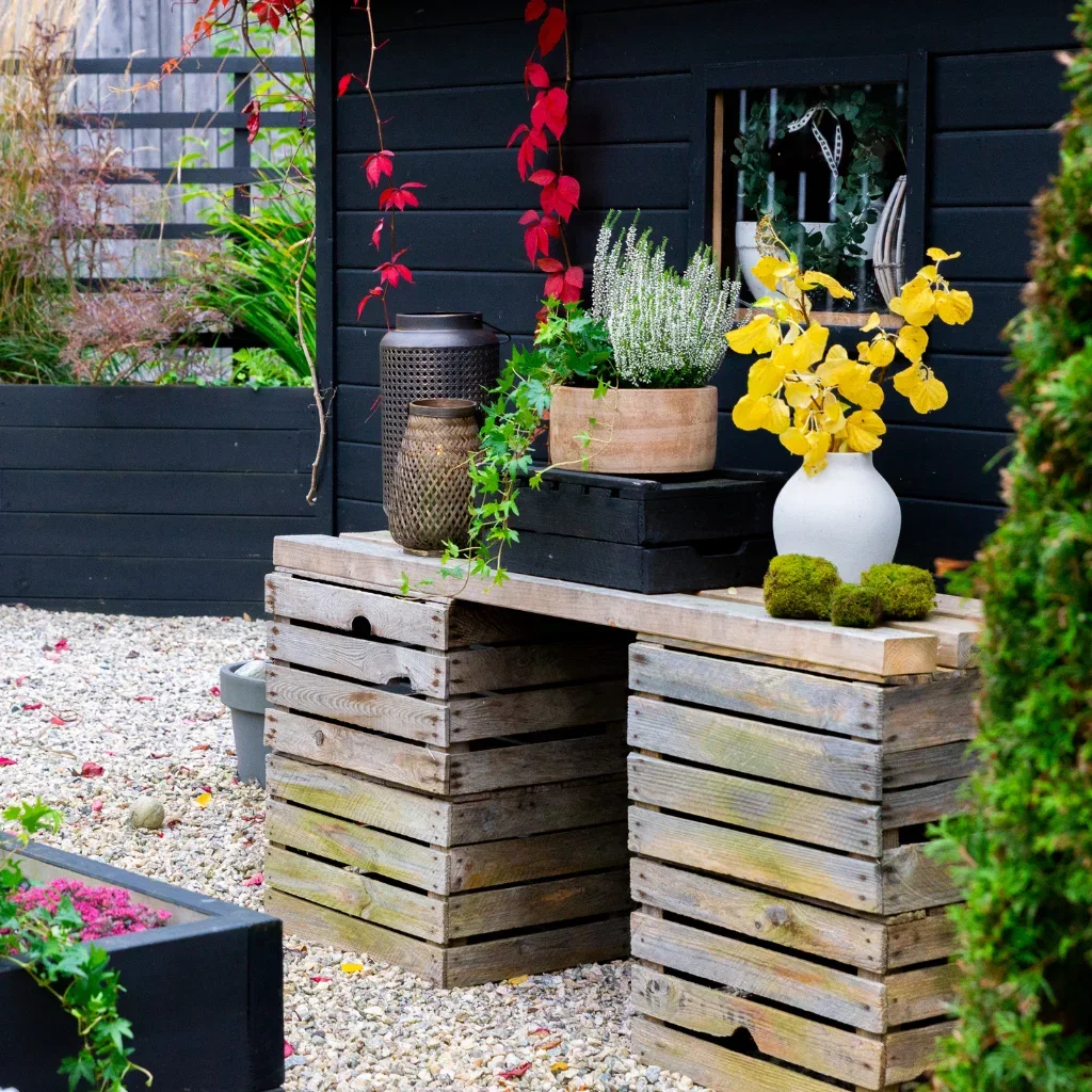 - Ved å stable to trekasser i høyden og legge noen planker over har du laget et fint, smalt bord. Her kan du sette potter, pynt og dekorelementer og skape ulike stilleben. Uttrykket kan endes gjennom sesongen.
