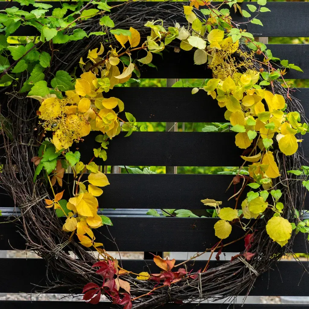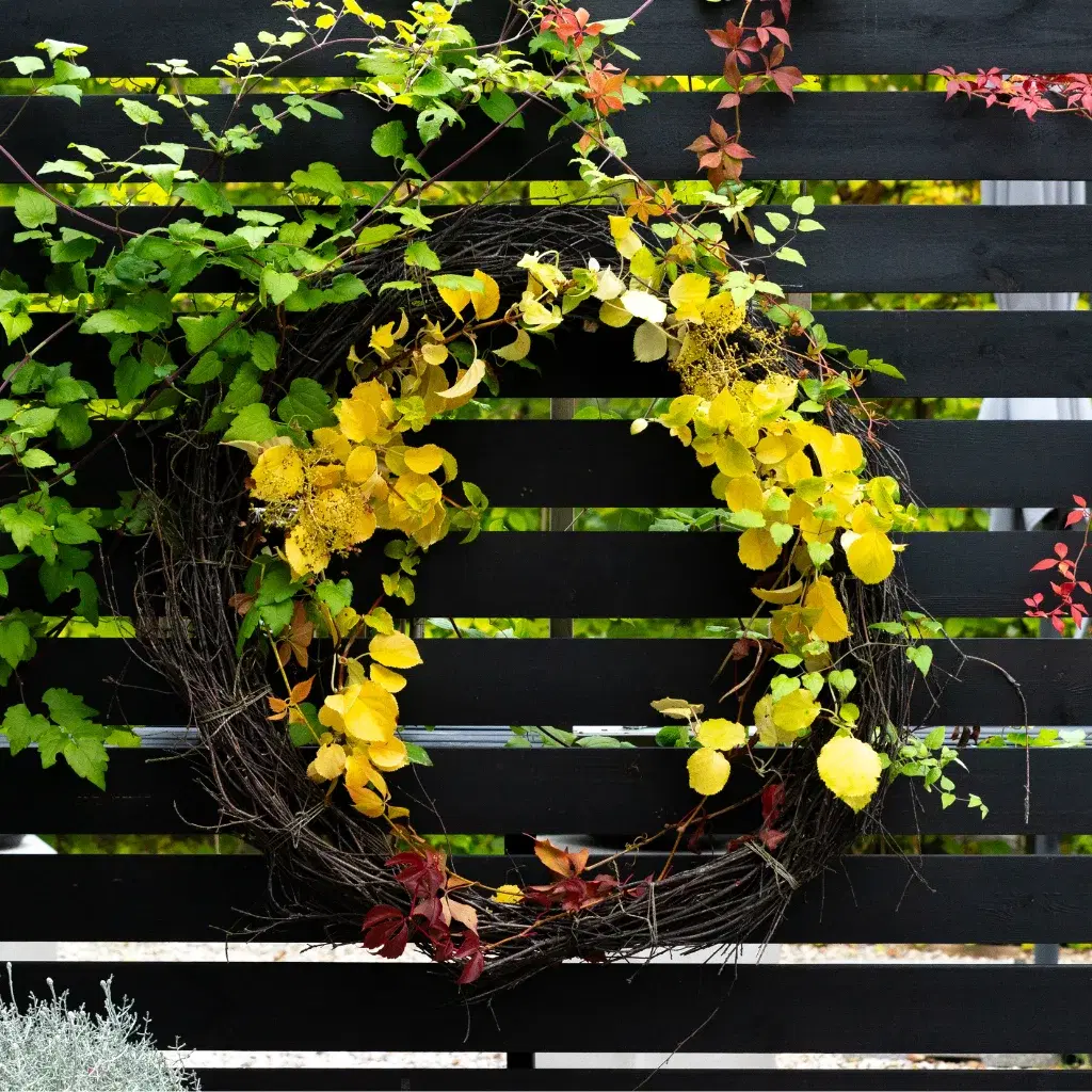 Denne store høstkransen har Sylvia laget ved å surre greiner rundt en gammel rockering. Frittvoksende villvin, klematis og klatrehortensia står for naturlig dekor med sine fargerike blader.