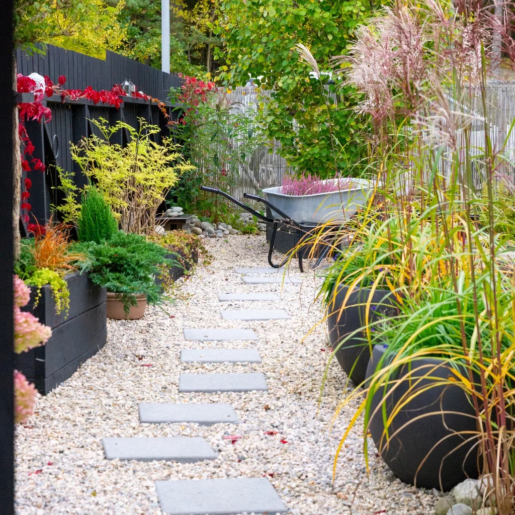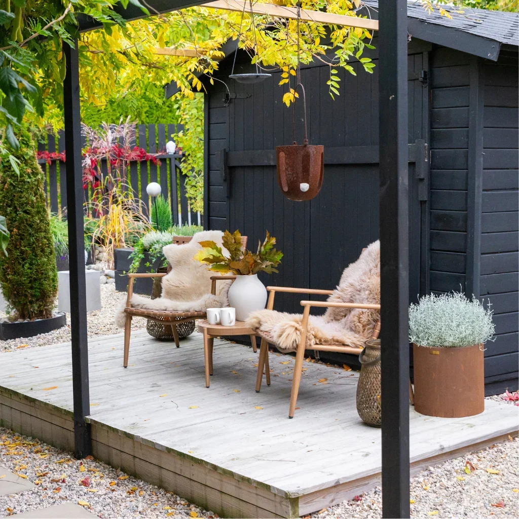 Sesongen er på hell, og med det følger en helt egen ro i hagen. Tiden er inne for å nyte framfor å jobbe. Sylvia og Tore bruker hagen til å hente seg inn og lade batteriene, noe som trengs med to krevende jobber. Blandingen av naturelementer som grus, tre, mørke farger på kasser og gjennomtenkte siktelinjer bidrar til å skape ro både i uterommet og hodet.