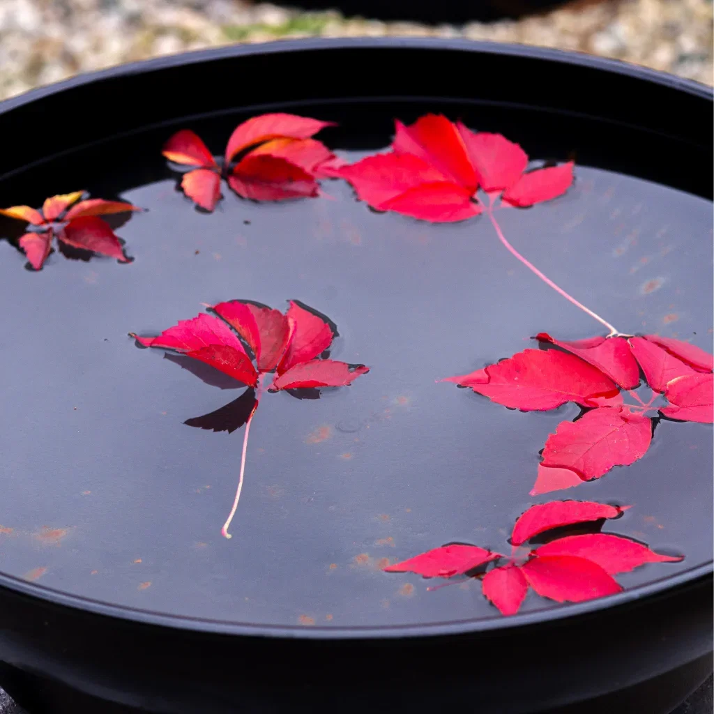Flytende knallrød villvin skaper vakker og naturlig høstdekor i hagens vannspeil.