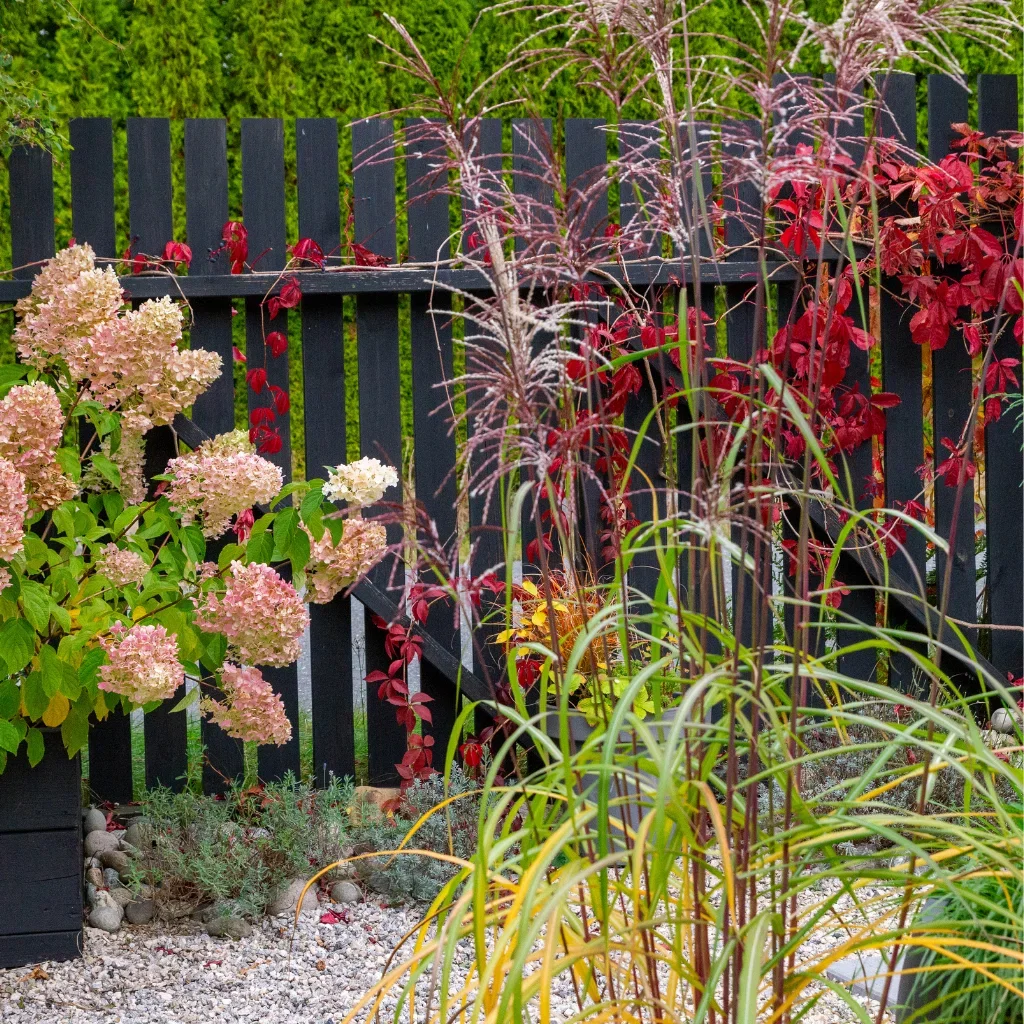 Purpurfarget prydgress, rosa syrinhortensia og knallrød villvin mot det stramme, sorte gjerdet bidrar med spennende farger og former i høsthagen.