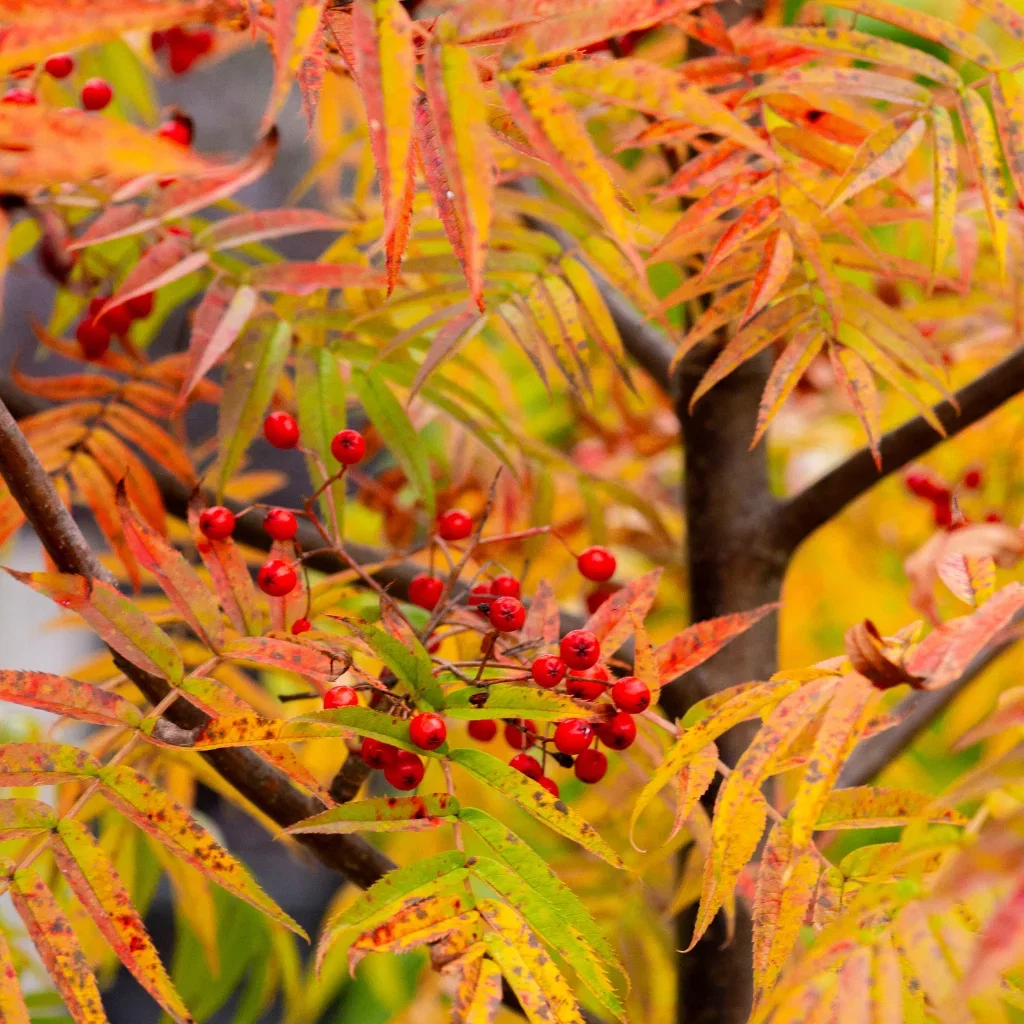 Korearognen er litt av et skue der den strekker seg mot høstsolen med sine flammende, knall oransjeblader og røde bær.