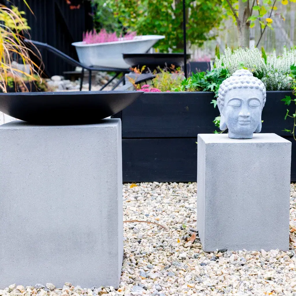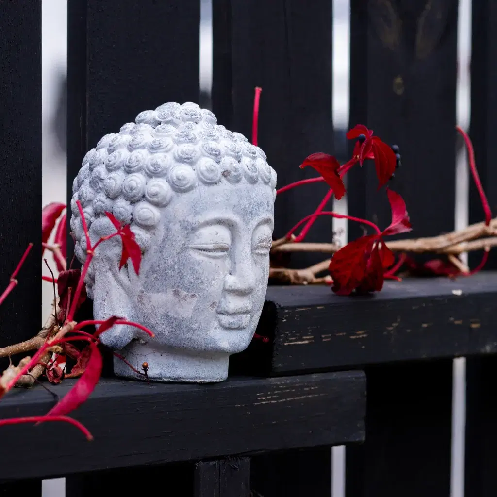 - Dekorelementer med ulike former og teksturer som glatte buddhahoder og knudrete moseballer er spennende innslag.