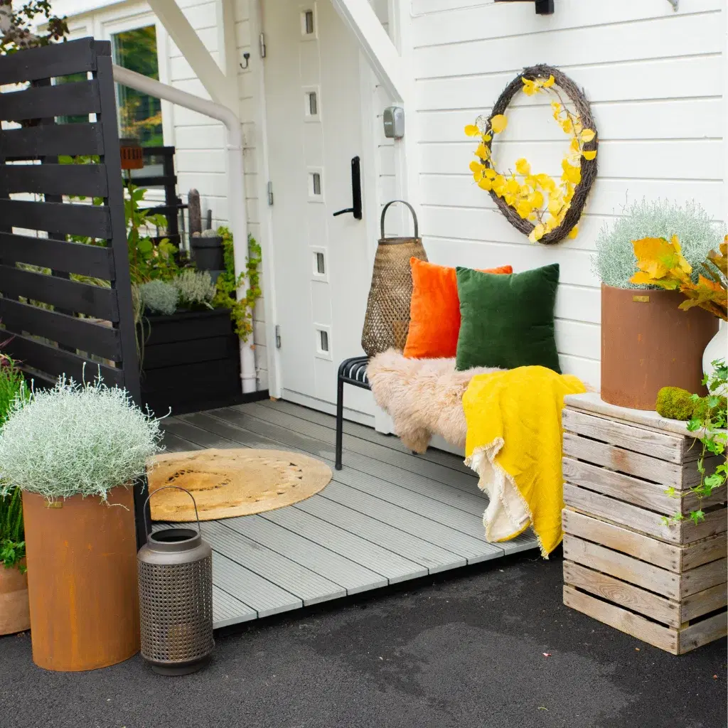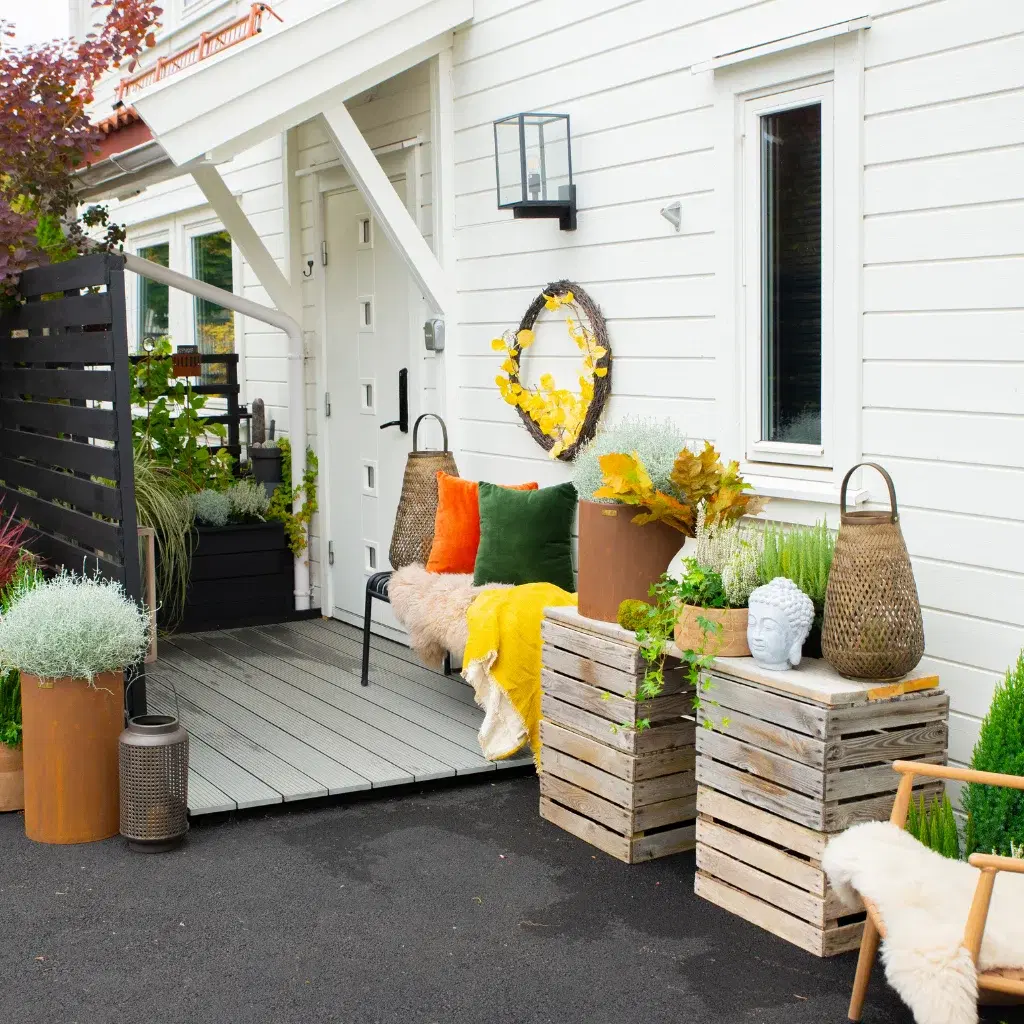 Varm velkomst! Inngangspartiet har fått en skikkelig oppgradering for å gå høsten i møte med lunhet, tekstiler, frodige planter. Som ellers i Japandihagen repeterer Sylvia også her samme planter og krukker for å skape harmoni. Bordet har hun laget ved å stable tomme trekasser og legge planker på toppen. Her kan hun endre uttrykk gjennom sesongen. Smart og dekorativt!