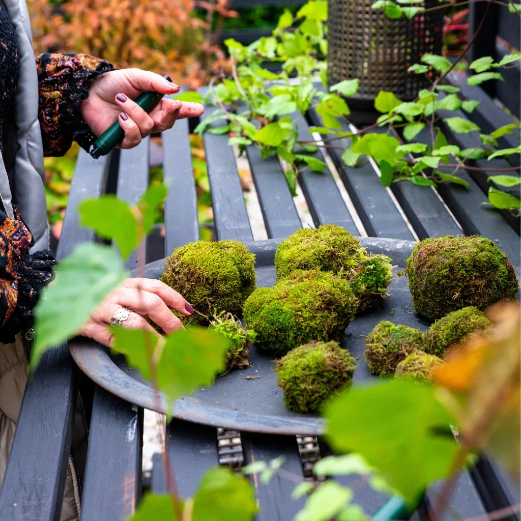 Moseballer lages enkelt med vikletråd. Det stramme, men samtidig naturlige uttrykket passer godt inn i Japandistilen. De kan for eksempel henges som pynt under trær eller brukes som dekor på fat og rundt lykter.