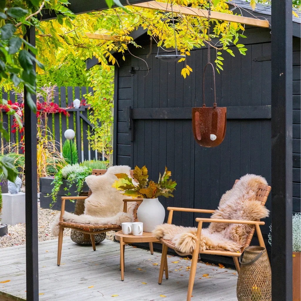 - Sett fram lykter som kan tennes når det skumrer. Det er ekstra hyggelig om du venter besøk. Bruk gjerne batteridrevne led-kubbelys og telys så slipper du å følge med på dem. Husk å velge de som tåler å stå utendørs.