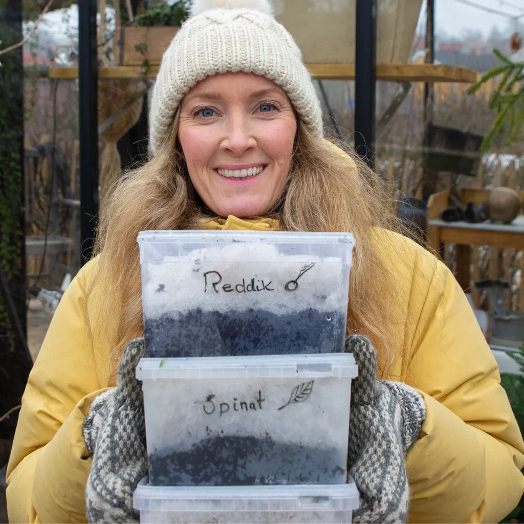 – Jeg har fått dilla på å så grønnsaker ute i smågodtbokser. Siden vi ikke har noe eget planterom inne, er det helt gull. Det at plantene vokser opp robuste og ikke trenger å herdes, sparer meg for mye tid. Og så er de høsteklare ekstra tidlig. Det anbefales på det sterkeste!